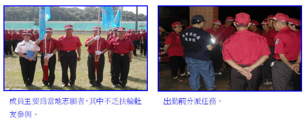 由於該組織係為一義務性組織,除政府適度補助外,其所需設備與人員主要仰賴民間自發性的捐獻和義務投入。因此本項