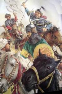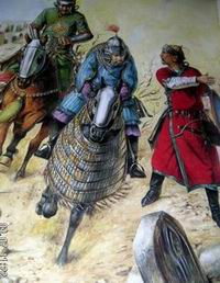 圖示成吉斯汗之第二代、第三代在中東征戰時的景色,圖片取自「蒙古勇士」一書,作者David Nicolle,製圖:Richard Hook。服裝、武器與馬匹裝飾據云係參照中東諸國博物館所陳。