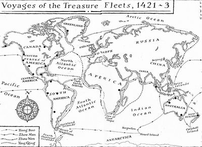 張君又引用鄧小平84年談話:「明末鄭和之後的百年閉關自守至使中國貧窮落後,愚昧無知,不開放不成」。江澤民主政時亦多次論及鄭和下西洋的時代意義。「……中華民族在歷史上就致力於和各國人民友好往來,進行文化、經濟交流,共同創造美好的未來」。 鄭和明年六百年祭有它的歷史目的與意義。他在天之靈等了六個世紀才有今天揚眉吐氣之時。兩岸人士都同意是值得歡笑而敬酒!偉大的鄭公!在海洋上廿年創世界紀錄,當然是可觀的成就,無可厚非。筆者猶敬仰你管理的才能與思想的開朗。亦是六世紀來的唯一成就者。時至今日猶”前無古人”。非筆者嘩言取寵,當然要有根據。且看一位英國海軍將官的研述。他理應無中國人封建思想的包袱與毒質。 本年春上市的新書「1421年—中國發見美洲」的作者Gavin Menzies,是英國海軍潛艇軍官,根據航海家麥哲侖、甘馬、哥倫布等人之航行線考察當年舊地風光。為了研討1421年鄭和之史實,訪問過120個國家與900餘處博物館與圖書館。 於開章第一頁他就坦然說明:此書雖是用他的名義出版,但事實上是許多個集體學者的聯合研討結果報告。在眾多參入研討單位中特別指出銘謝下列單位的和盤托出,英國博物館、中國西安歷史博物館和利馬歷史博物館……無法詳列。尤其是近百位中外學者毫不保留的意見參考。 筆者無義務為此書及其作者宣傳。作此介紹只因他所考證後的結論爭議性非常大。幾乎許多近五百年的歷史因此要重寫。更不保留、毫不客氣指出許多史料是故意扭曲。所謂之事後的重新更正更是荒謬。但他有科學依據之証,難於否決斥為無稽之談。書的後面附帶著147頁的資料來源說明,使人啞口莫辯。好比檢驗書說那是私生子的DNA與你相符,你如何反駁躲避?你雄辯口才與閃電般的智慧都不如說聲:「親愛的寶貝兒子!誰說爸爸不仁慈呢」?!(只有你和上帝知)。 讀該書內容多次令筆者拍案叫絕,「怎麼可能」?「夠偉大」!「可憐多年前被誤導且為謬論維護」!料想讀者也會驚嘆。下列均為節譯自該書的重要章節,不重提聲明。