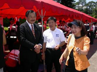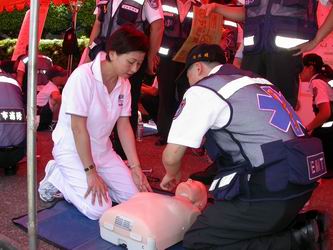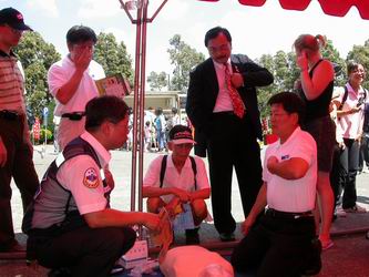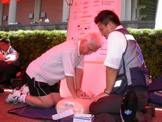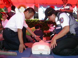 松江社報導 社會服務—0919千人CPR 0919千人CPR,這是我們和劍潭、明水、台中松竹等四位社合辦捐贈的活動,去之前我想這將是一個〝無聊〞的例行活動。沒想到,到了現場,台北市政府消防局然還舉辦了很多消防活動趣味競賽,把消防知識融入園遊活動中,因為和VP Andy及其小扶輪哲哲太早到了(9:45就到現場)我們就先去玩活動,消防栓瞄準目標噴水救火,強化玻璃如何擊破,煙霧逃生墜道。還有擬模1-8級地震的體驗,雲梯的乘坐、直昇機……等相當有趣,當然最重頭戲是CPR的練習,由我們四社捐贈的20位模擬娃娃—安妮,一個個躺在地上,讓大家報名學急救。 首先先填好個人資料,再領一張學習証,就被引導到安妮之一的身邊,並有專人講解,並一一指導學習(有的指導員還會講英文、印尼話呢)首先(1)要拍打”急救者”肩膀,呼叫他是否有反應 (2)趕快請2位以上路人打電話叫救護車 (3)眼看、耳聽是否有呼吸?! (4)開始急救—先抬下巴,再遵照15及2即快速按15下,2次2秒的口對口人工呼吸,按摩時必須雙手上下環扣放在氣管及乳頭的交叉點上如幫浦式快速按15下(要口中數-15),再吸氣口對口(必須嘴巴含住才不會漏氣)如此反覆四次再觀察是否有起色,視狀況再重覆15及2的動作……,聽似容易做卻難,只見大家雙腳脆地,認真的做起CPR,有的不是氣吹不進,就是太用力壓胸,做完大家己滿頭大汗,汗流夾背的,不過我們的Kelly倒是很正確的示範出,(原來他在加拿大有學過呢!) 劍潭輔導社Jill社長更可愛,看到我們在照相,不顧急救未完成馬上跑過來合影,之後才再回去繼績急救 (幸好,不是真人,不然…就太可憐了)終於完成了CPR急救每個人在卡片上蓋下印章完成重要的課程,當然今天最重要的是要領獎呢!日正當中終於等到上台的時刻,手上拿著副市長給的獎杯,完成我們神聖的使命,副市長感謝我們捐贈20具安妮,但大保母說:「這只是開始,陸績將會有更多團體跟進」。 的確,扶輪社社會服務只是拋磚引玉,希望引起大家的注意更多的投入,讓CPR成為每個人必會的技能之一,在此也感謝我們松江社友—PE Sam、VP Andy及小公子哲哲、Kenny夫人及二位公子、Kelly的參與。 |