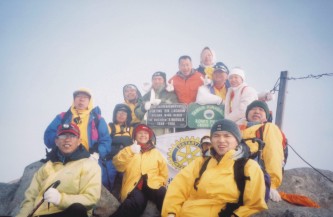 這時候大家的步伐逐漸加快,原本在後面隊伍的Stone叔叔、Esther阿姨和C.M.叔叔不斷地超前,每個人都想趕快爬到山頂,而我由於腳越來越痛,在最後幾百公尺的路上,幾乎真的是用「爬」的,還好趕在風雨來臨之前終於爬上了山頂。站在山頂上的標高牌旁,看著上頭4095.2公尺的標示,我們大家拉著扶輪社旗拍照留念,不禁想要大聲喊出:「我們終於成功了!」