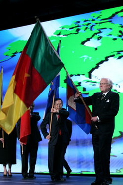 於聖地牙哥的國際講習會與會者揮舞著國旗 Participants wave flags from scores of countries represented at the International Assembly in San Diego. / Photo by Alyce Henson/RI |