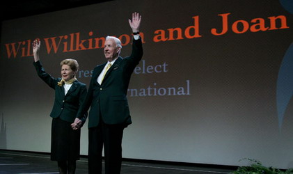 國際扶輪社長當選人魏京森與妻子瓊向532位地區總監與眷屬的群眾們打招呼。 RI President-elect Wilkinson and wife Joan greet the crowd of 532 district governors and their spouses. / Photo by Alyce Henson/RI |