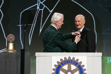 國際扶輪社長當選人魏京森(左)以及國際扶輪社長白義德互換領章以示範長期扶輪的傳統。 RI President-elect Wilfrid J. Wilkinson (left) and RI President William B. Boyd demonstrate the longstanding Rotary tradition of exchanging pins. / Photo by Monika Lozinska-Lee/RI |