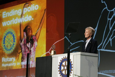 前地區總監西爾維亞談到扶輪公共形象,鼓勵其社區內的扶輪社員使用資源包括人道行動錄影,英文扶輪月刊影音雜誌,和交互來促進扶輪。 Past District Governor Sylvia Byers spoke about Rotary's public image, encouraging club members to use resources including Humanity in Motion videos, RVM, and Interactive to promote Rotary in their communities. / Photo by Monika Lozinska-Lee/RI |