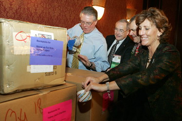 扶輪領導人的配偶準備好的箱子來填裝書本和學校用品以便幫助去促進識字。 Spouses of Rotary leaders ready boxes filled with books and school supplies to help promote literacy. / Photo by Monika Lozinska-Lee/RI |