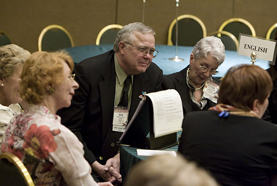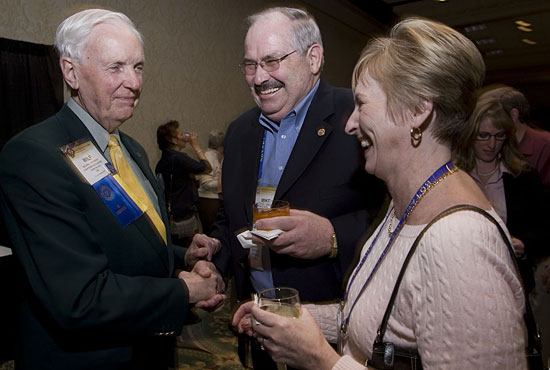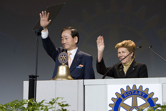 在一場配偶全體會議,國際扶輪社長當選人李東建與國際扶輪社長魏京森的妻子瓊•魏京森,迎接總監當選人的配偶們。