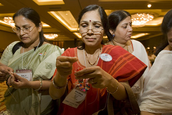 在國際講習會的配偶文化交流當中,來自印度的一位出席者嘗試穿串著印地安人珠寶串珠的飾物。