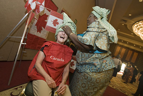 在配偶文化交流的一位出席者接受一種非洲頭巾包裹。