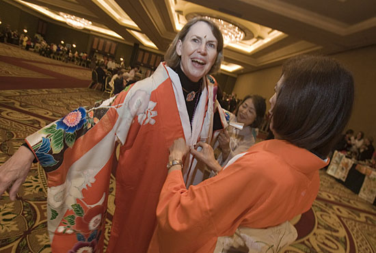 在配偶文化交流,日本配偶協助一位參加的夥伴穿著一件和服。