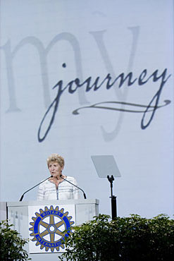 在一場配偶全體會議當中,國際扶輪前社長威廉•白義德的妻子洛娜•白義德,分享她作為一位扶輪社員配偶的經驗。