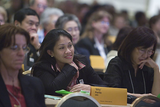 在一次配偶全體會議上,配偶們聆聽著演講者,例如洛娜•白義德和李洋子的演說。