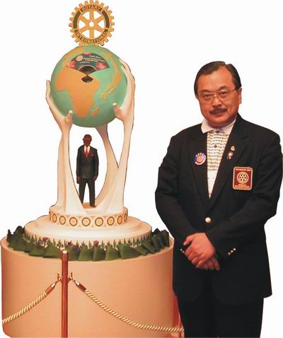 D3520前總監邵偉靈PDG Dens攝於大會特別製作巨大糖果雕塑之國際扶輪社長馬奇約伯Jonathan Majiyagbe的塑像旁。 該巨大糖果雕塑之國際扶輪社長的塑像是被放置於Rihga Royaj Hotel大廳之中,它業已成為參與大會社員們爭相攝影的焦點。 該巨大糖果雕塑是以國際扶輪社長馬奇約伯Jonathan Majiyagbe站在四隻〝伸出援手〞的中間 來表現─奉獻服務,載負著地球的決心。 |
