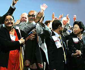 於2005年國際扶輪國際年會正式閉會前,扶輪社員們齊聚台上唱著傳統驪歌Auld Lange Syne 。照片:Monika Lozinska-Lee |