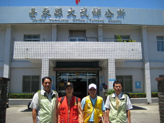 Dentist帶領,迎接一行8人直駛大武鄉公所聽簡報,大武鄉房屋全毀19戶、半毀30戶、淤塞131戶,災情慘重,國際災難救援機構派來台灣的4位組員,有2位(英國籍)已提前來災區勘查過,決定先撥50個〝急難庇護屋〞給大武鄉。匆匆的用過台東魯肉飯後,一行人驅車來到大武國小,那裡有個老舊的籃球場,有屋頂可擋雨又有自來水及衛生設備,可搭8~10個庇護屋,於是全台灣第一個庇護屋即落腳於此。