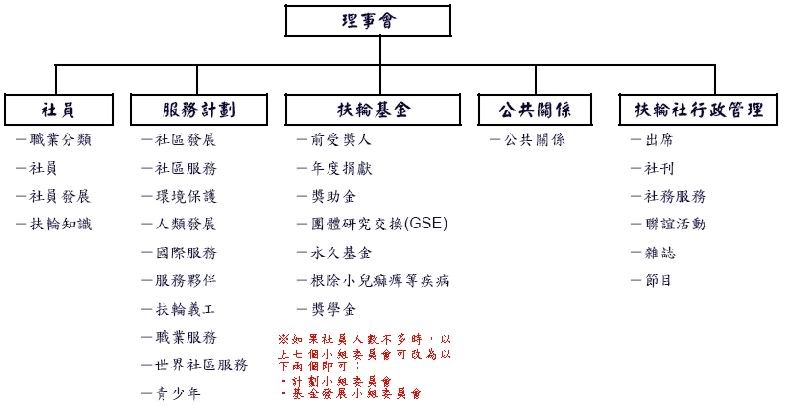 扶輪社委員會架構依據建議扶輪社細則而來。扶輪社委員會用來完成扶輪社的長期目標。扶輪社委員會主委們向扶輪社理事會報告所有委員會的活動。標準的扶輪社各委員會被指派如下: |