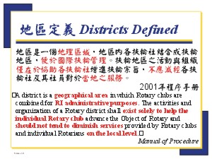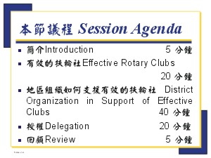 地區組織如何支援有效的扶輪社 District Organization in Support of Effective Clubs (90分鐘) I. Introduction 簡介 (5 分鐘) ◆ 投影片 2-a