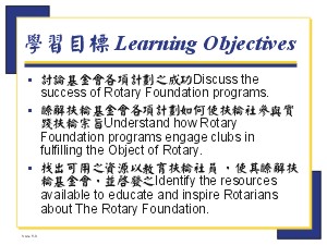 II. Rotary Foundation Programs – Fulfilling the Object of Rotary 扶輪基金會各項計劃—實踐扶輪宗旨 (40 分鐘) ◆ 投影片 5-d