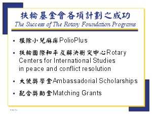 第五節: 扶輪基金會各項計劃 The Rotary Foundation Programs(90分鐘) I. The Success of The Rotary Foundation Programs (20 分鐘) 扶輪基金會各項計劃之成功 ◆ 投影片 5-a