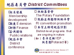 2. 投影片Overhead transparencies a. 地區委員會District Committees *你或許希望將此講義影印分發給參與者。 請注意,本刊物每三年改版一次。請到扶輪國際網站www.rotary.org,可以找到〝扶輪政策彙編〞Rotary Code of Policies最新的版本,是講義3-a〝地區領導計劃政策〞的資源。