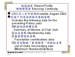 訓練領導人備忘錄 - 向參與者解釋儘管國際扶輪理事會已經核准了最低標準政策,支持並加強這項政策的機能,於2002年8月前,將無法充分的得到。在那時間,國際扶輪將提供總監一份列示在他們地區內不符合最低標準扶輪社的清單。