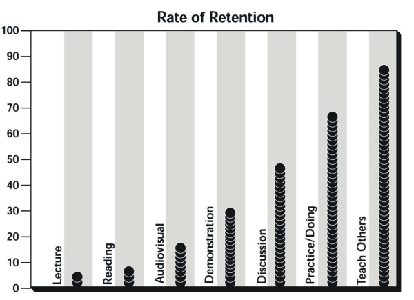 維持最大注意力的訓練 Training for Maximum Retention 要了解到參與者的特性與需求是有效訓練成果平均值的一部份。你必須也要考慮如何去呈現資訊以達成知識與概念的維持注意力。 如下圖所示,光靠演講本身並不足以促進重要知識的維持注意力。如果參與者能夠實地演練所學,將較有可能來記住其學得的知識。而給予參與者間有機會彼此來相互教導以獲更高程度重要觀念、技能及知識的維持注意力。 維持注意力程度Rate of Retention
