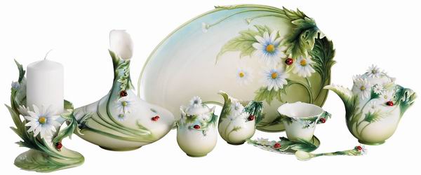 法藍瓷特色與風格 以西方新藝術(Art Nouveau)流暢線條,完美融入了東方典雅的人文氣質。將大目然的花草丰姿、蟲鳥律動、原野的奔放以立體造型呈現於作品之中。極佳的視覺效果,將藝術帶入生活。 品質方面,法藍瓷採用高品質細緻瓷土及獨家配比,運用釉下彩技術,在1,200~1,350℃高溫下鍛燒完成。成品溫潤通透,色澤晶瑩典雅。所有產品均有美國食品衛生局(FDA)及84 / 500 /EEC認證。在環保理念上,法藍瓷產品堅持不加骨粉,以技術達成與骨瓷同樣的通透效果。 在用途方面,法藍瓷有各種不同的風貌—藝術、溫馨、嫵媚、典雅、人文,適合各種型態的居家佈置或收藏。選為禮品,可藉著大自然的圖像語言,傳遞各種溫馨的訊息及祝福,以滿足客戶對人際關係,品味生活(真、善、美)的追求。 法藍瓷的設計團隊是由一群喜歡探索大自然,追求真、善、美境界的藝術家所組成,有著共同的環保理念與萬物皆取之於自然、與大自然共存共榮的共識。 |