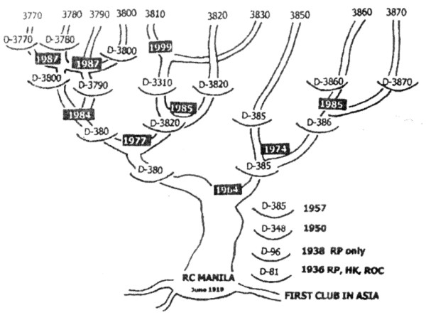 ROTARY IN THE PHILIPPINES:A Historical Sketch(Compiled by: PDG Plutarco ¡§Cocoy¡¨ velez) Fourteen (14) years after Rotary Club was organized in Chicago, Illinois, USA in 23 February 1905, a leading businessman of Manila and president of the Lambert Sales Co., inspired by what he heard about Rotary, started to correspond with Pre. John Poole of the International Association of Rotary Clubs, know as Rotary International.As a result, Rtn. Roger D. Pinno of the Rotary Club of Seattle, Washington, Club No. 4, was sent to Manila to assist in the organization of the Rotary clubs in the Far East. At the luncheon meeting given by Lambert, E,E. Elser, James Geary, A.W. Bram and F.M. Berry prominent besinessmen in Manila who were present, constituted themselves as a committee to organize a Rotary Club with Lamber as chairman and Berry as secretary. After three(3) meeting in January, the club was completed with 38 members. On June 1, 1919, the Rotary Club of Manila was admitted to mwmbership in the International Association of the Rotary Club- the first Rotary club in the Philippines and in the Orient. RC Manila was granted Chapter 478. Towards the end of 1929 efforts were made to organize Hongkong which was granted Chapter 3413. Club organize before WW II were: Manila -June 1, 1919 Cebu -November 28,1932 Iloilo -April 22, 1933 Bacolod -June 16, 1937 Baguio -February 21, 1937 Davao -October 28, 1938 Dagupan -December 29, 1938 Dumaguete -February 27, 1939 At the outbreak of war, all of the 8 clubs were disbanded.In 1945 (after the war) the first RC that was re-establish was Dagupan. RC Manila. During RY 1945-46, only of 5 of the pre-war Rotary clubs were re-establish, namely: Cebu, Bacolod, Baguio, Dumaguete anf Davao. The following year, RC Iloilo was re-establish. Subsequently, other Rotary Clubs were considered as Non-District clubs and were under the supervision of the President and the Board of Director of RI until the 1936-1937. In 1935, while Manila was still a Non-District club, it hosted the 5TH Pacific Regional Conference which was attended by no less thwn Paul Harris, the founder of Rotary. In as much as there were already 11 clubs in mainland China, plus the Hongkong clubs, District 81 was established to include the 3 clubs in the Philippines. At the end of RY 1937-38, THER WER 5 Philippined Rotary clubs including Baguio which was re-established 21, 1938. In the wame twer, District 81 was changed to District 96 as the long RI District for the Commonwealth of the Philippines. In RY 1949-50, District 96 was re-named to District 348. During RY 1957-58, District 348 was changed to District 385. Thud, District 385 the mother of all tha 10 rotary district organizes in the Philippines. The following are the 10 Rotary District in the Philippines in the order of its organization: District 385 -1957 (from D ¡V 96) District 3790 - 1984 District 3800 - 1964 District 3810 - 1985 District 3860 - 1974 District 3780 - 1987 District 3820 - 1977 District 3770 - 1987 District 3870 - 1984 District 3830 - 1999 Philippines Rotary never run short of achieverd as it had produced outstanding Rotary of intrenational stature, like: 1. Former Ambassador Carlos P. Romulo- the Filipino to derve on the RI Board of Directos as 3rd Vice President in RY 1935-1936. 2. Former Senate President Gil J. Puyat- Appointed to the RI of Director as 1st Vice President in RY 1940-1941 3. Former Ambassador Francisco C. Delgado- served as RI Vice President in RY 1957-1958 4. M.T.A Caparas- served as RI President for RY 1986-1987 5. Sabino ¡§Benny¡¨ Santos¡¨-served as RI Director during RY 1989-1991. 6. Rafael ¡§Paeng¡¨ Hechanova- served as RI Director during RY 2004-2006 7. Jocelyn ¡§Joc-Joc¡¨- will served as RI Director during RY 2004-2006 As of June 30, 2001, the Philippines has 10 Rotaary Districts, 678 clubs and 19,280 rotarians.