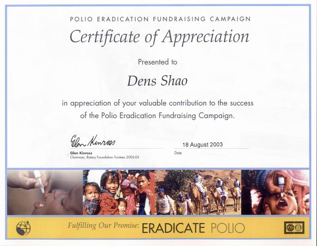 於2003年地帶扶輪研習會之會前會─地域扶輪基金研習會上, 獲頒根除小兒麻痺募款活動感謝狀。 |