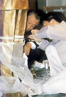 圖一 塑像在日本分成三節運至伊文斯敦由盛岡公彥(右)及助手盛岡志津重新組合。這座玻璃纖維漆銅塑像在國際扶輪世界總部16樓保羅.哈理斯室門外永久展出。
