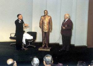 圖二 國際扶輪前社長艾企和及盛岡公彥在世界總部為塑像揭幕。大約100位來賓參加,包括多位國際扶輪理事、國際扶輪前社長拉珍德雷.薩寶Rajendra Saboo 、當地各扶輪社社長及其他來賓。 |