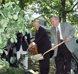 國際扶輪社長艾思悌士葛蘭Glenn Estess, Sr在芝加哥的摩爾根公園Chicago's Morgan Park鄰近之新的保羅•哈里斯之家博物館new Paul Harris Home museum外面種一棵慶典之樹,以慶祝扶輪百週年慶。照片:Noriko Futagami |