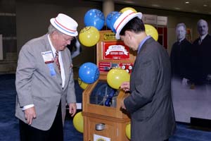 社長艾思悌士Estess與祕書長Ed Futa於新便士壓製揭幕式中,共同壓製一個紀念幣。照片: Monika Lozinska-Lee