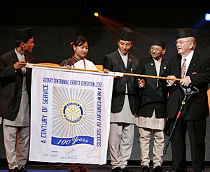 國際扶輪社長艾思悌士葛蘭接受尼泊爾扶輪青年服務團團員們為慶祝紀念扶輪百週年攀登聖母峰,並於聖母峰上所升起的旗幟。照片:Monika Lozinska-Lee |