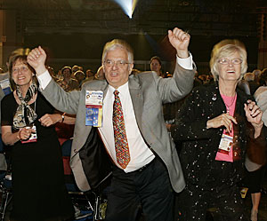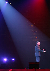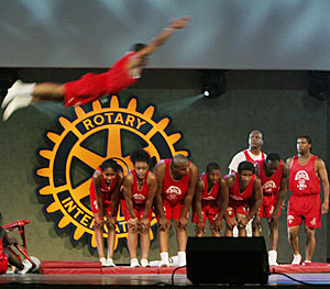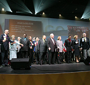於2005年國際扶輪國際年會正式閉會前,扶輪社員們齊聚台上唱著傳統驪歌Auld Lange Syne 。照片:Monika Lozinska-Lee |
