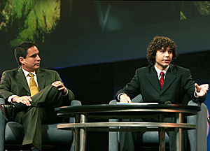 扶輪少年服務團團員Daniel Steck與美國德克薩斯州聖安東尼奧市的輔導老師Gabe Oviedo,於臺上論述他的扶輪少年服務團的保護環境社區計畫。照片:Alyce Henson |