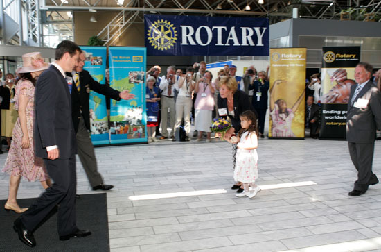 照片提供:Alyce Henson 國際扶輪社長施當恆Carl-Wilhelm Stenhammar孫女Sophia以獻花及皇室禮節歡迎丹麥王子Frederick及王妃Mary蒞會。 Photo by Alyce Henson RI President Stenhammar's granddaughter Sophia offers flowers and a royal welcome for Crown Prince Frederik and Princess Mary.
