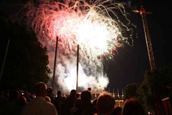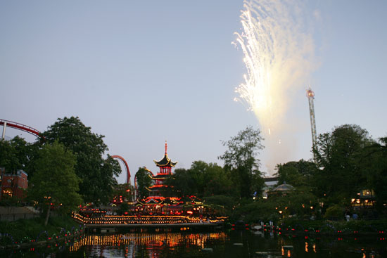 照片提供:Monika Lozinska-Lee 煙火照亮了堤佛里日的夜空。 Photo by Monika Lozinska-Lee Fireworks light up the night sky during Tivoli Day.