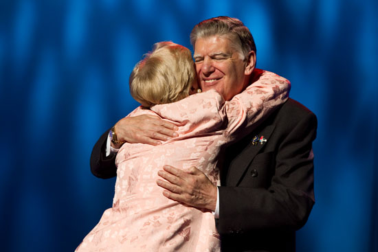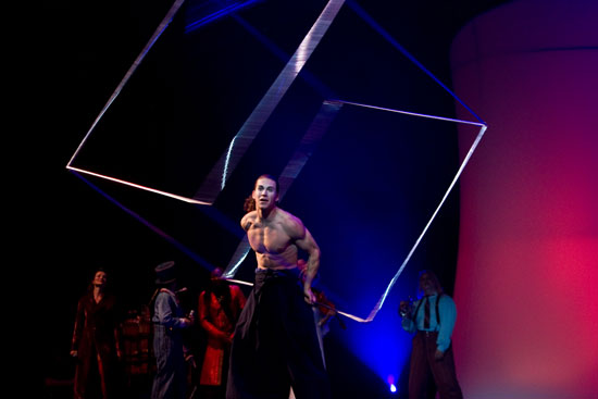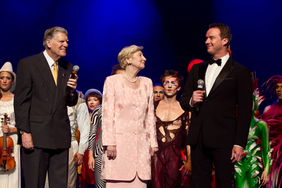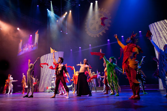RI President John Kenny onstage with Cirque du Soleil performers.