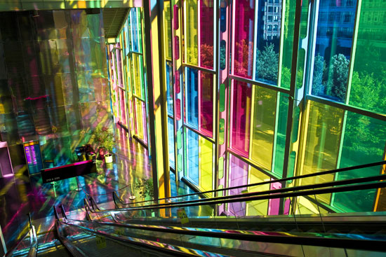 The afternoon sun streams through the colorful windows at the Palais