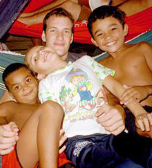 While traveling on a boat on Brazil's Amazon River, Chesa Boudin enjoys a special moment with a friend's daughter and her two chums. Photo courtesy of Chesa Boudin