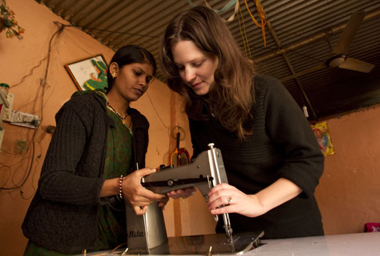 Hannah Warren(右)幫助女裁縫師Deepa調整由Jhoole捐贈給她的新縫紉機。
