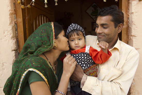 Deepa與她的先生和他們的女兒攝於他們的家的門口裡。