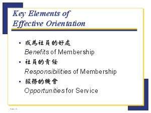 ◆ What are reasons that existing members leave Rotary clubs? 現有扶輪社員離開扶輪社的理由有哪些? ◆ How can your district address these issues? 貴地區如何解決這些問題? ◆ Why is new member orientation so important? 為何新社員輔導是非常重要的一件事? ◆ What are key elements in an effective orientation program? 有效的輔導計劃有哪些關鍵要素? ◆ 投影片 3-d