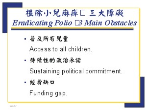 ◆ What can you do as governor to continue to support the goal of polio eradication? 你作為總監應如何繼續支持根除小兒痲痹的目標? ◆What must Rotarians do to participate?扶輪社員該如何參與?