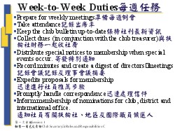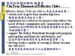 材料Materials: 1.講義* 2.投影片 a. 一位扶輪社秘書的責任A Club Secretary’s Responsibilities b. 有效能扶輪社的四個要素The Four Elements of Effective Clubs c. 每週任務Week-to-Week Duties