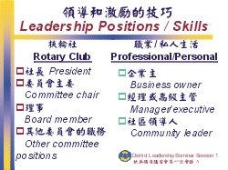 訓練領導人的備忘錄Training Leader’s note: — 往後的十分鐘請利用投影片1-A及講義1-A做一個分組練習group exercise。 — 請每一個人或每兩個人一組,分別寫下在他們的扶輪社,以及其職業生涯當中所擔任過的領導性職務,需要一些什麼樣的領導技巧。 — 要求參與者就工作單上所列出這兩列職務所分別需要的技巧當中,紀錄那些是可以、或不可以通用的。個人練習結束後,在以小組來討論結果。