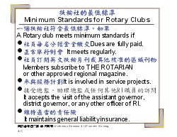 Ñ關鍵點 □ 對所有扶輪社最低標準的目標被意味著確保所有的扶輪社是它們的社區重要且成長的部分。 □ 這些標準被設計去促進正在掙扎的扶輪社之間強化、合作努力,以及有經驗的扶輪社員去提供實質的導引和支持。
