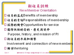 貴社的新社員訓練計劃的要素是什麼? What are the elements of your club’s new member orientation program? 關鍵要點Key points: □ 社員的益處Benefits of membership □ 社員的責任Responsibilities of membership □ 服務的機會Opportunities for service □ 國際扶輪的目的,歷史與使命Purpose, history, and mission of RI □ 新社員的參與和聯繫Involvement and connection of new members □ 輔導Mentoring