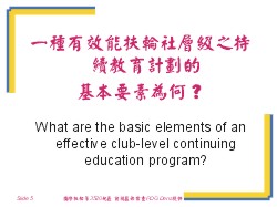 關鍵要點Key points: □ 每年作社員意見調查考以發覺目前他們所感興趣的議題是什麼。 □ 收集每一次繼續教育計劃或者演講方面的反應意見。 □ 將對貴社的繼續教育策略有興趣的扶輪社社員組成一個委員會來負此一責任。 訓練領導人的備忘錄Training leader’s notes